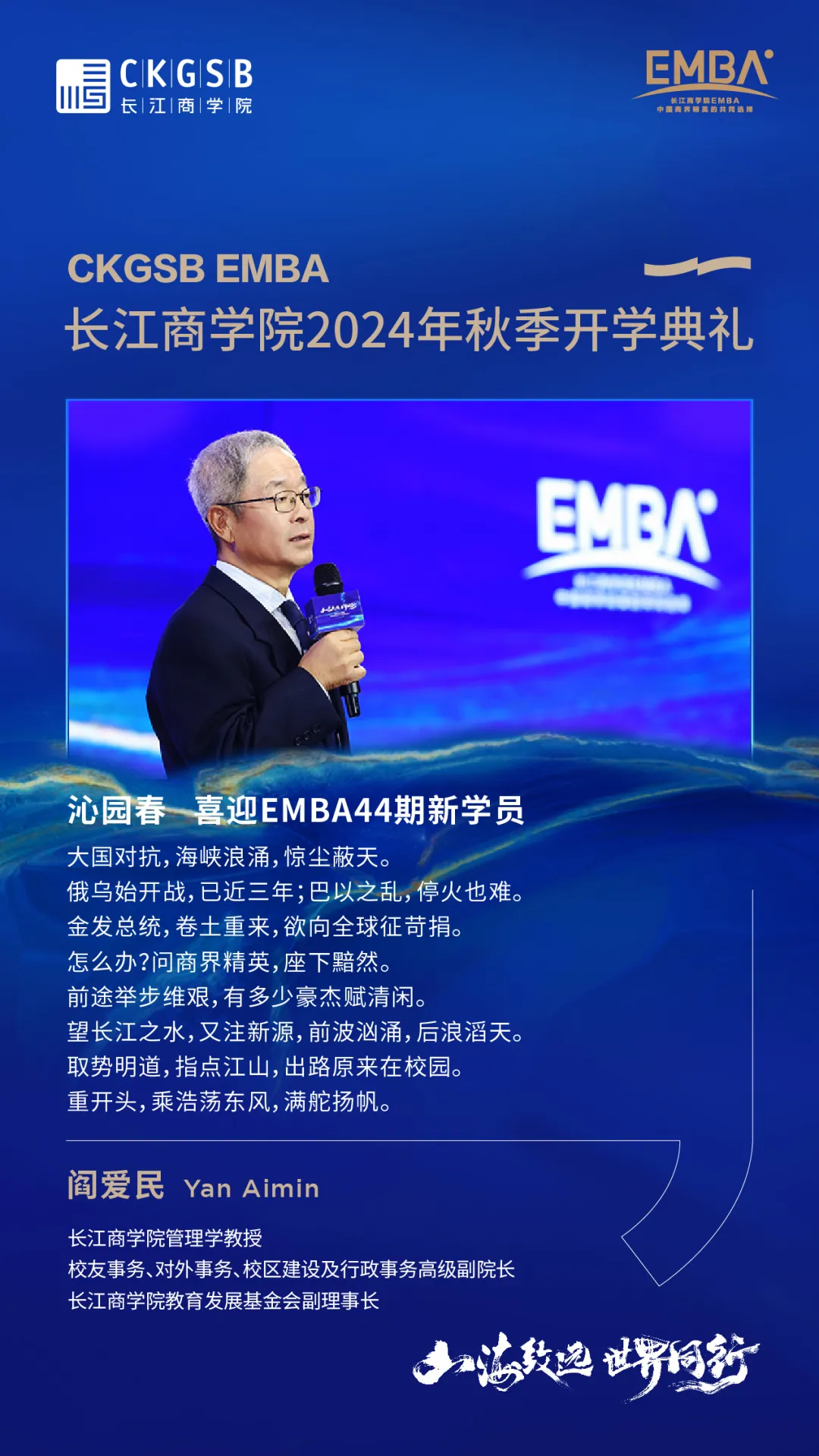 动情之处,阎爱民教授深情赋诗一首,送给EMBA2024年秋季班的新同学。