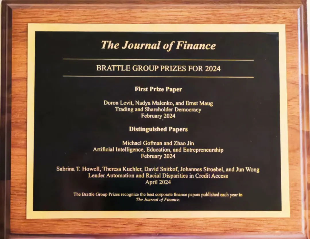 该奖项由金融学国际顶级期刊、位列金融学三大顶刊之首的《金融学杂志》(Journal of Finance, JF)从全年公司金融领域发表论文中评选得出,在国际学术界享有极高的声誉与含金量。金钊教授此次获奖,不仅是国际同行对其研究成果的高度认可,更是中国学者在全球金融学术舞台上的重要突破。