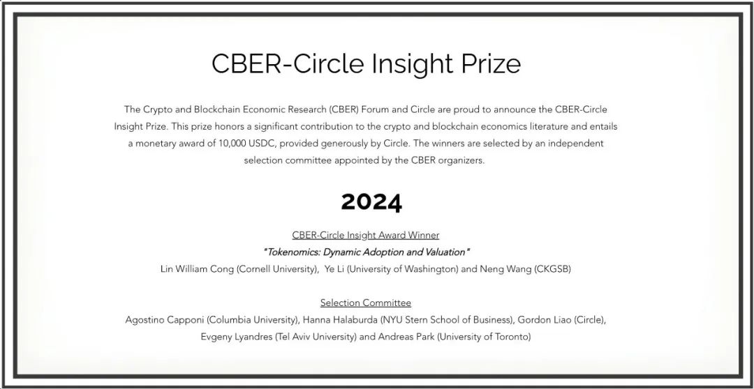 区块链经济学是近年来经济学研究中的重要前沿领域。CBER-Circle卓越洞察奖由区块链经济全球权威学术组织加密与区块链经济研究论坛(Crypto and Blockchain Economic Research, CBER)与美国金融科技明星公司Circle联合创立,每年在全球范围仅评选出一项最具突破性的学术研究进行表彰。