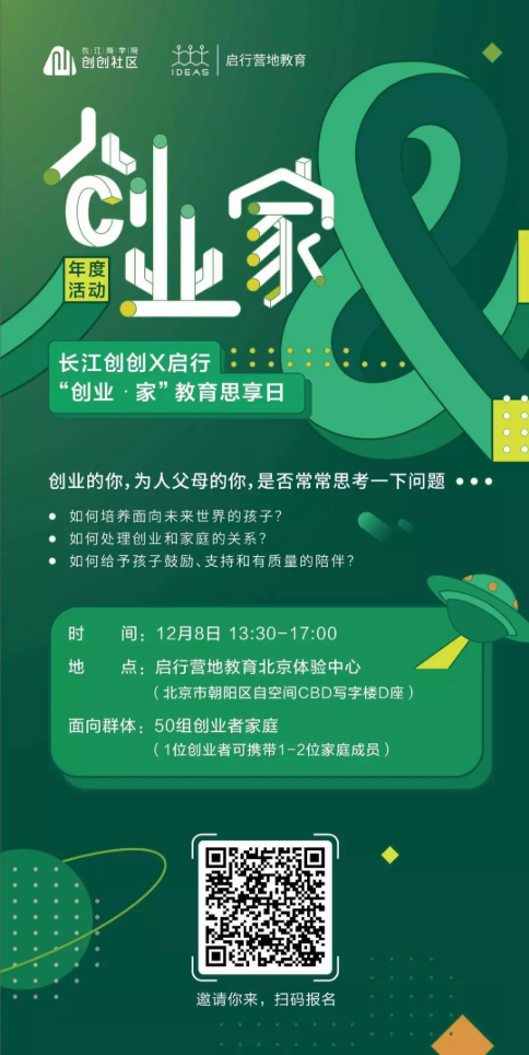 12月8日下午,長江創創將與國內最大的營地教育中心啟行教育聯合發起“創業 ? 家”教育思享日。歡迎創業的你和你的家庭一同前來!