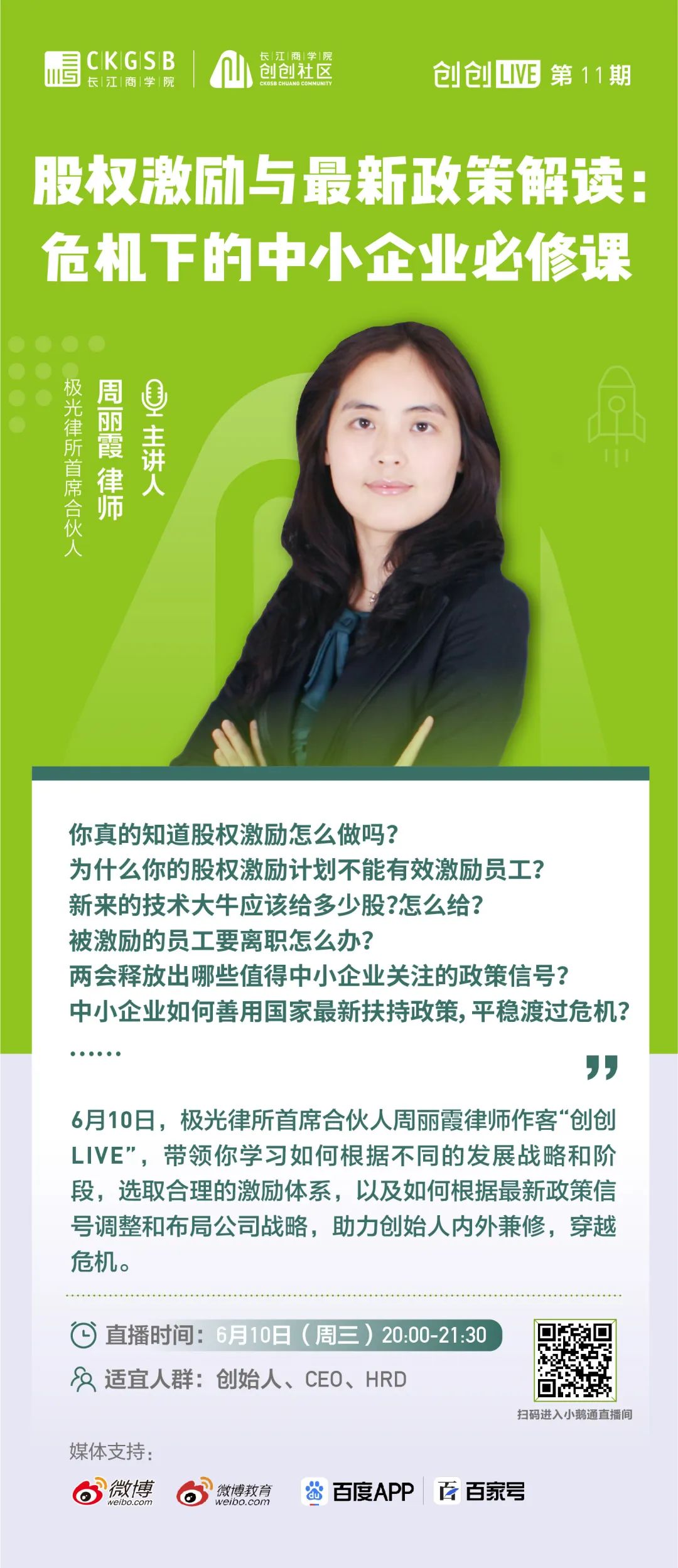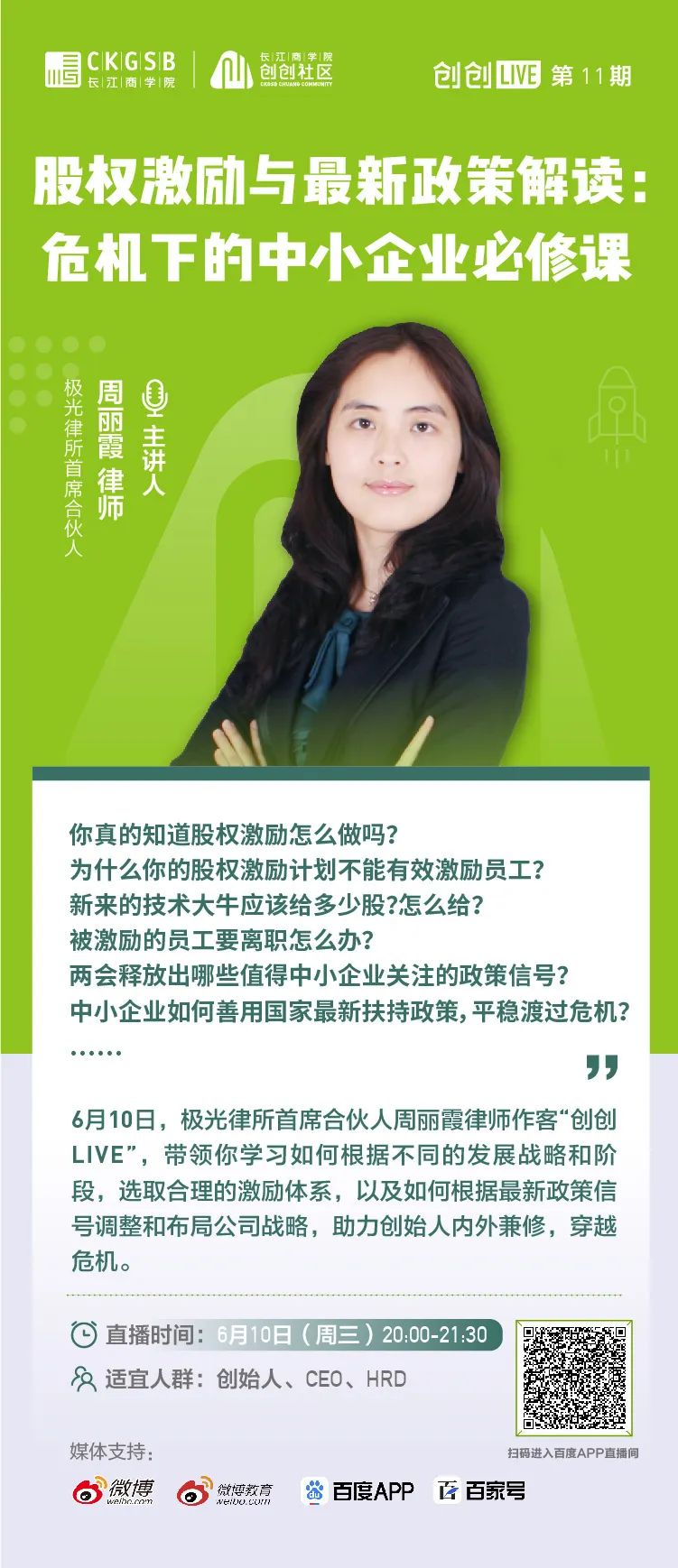 6月10日,長江創創特邀極光律所首席合伙人周麗霞律師作客“創創LIVE”,帶領你了解分層式動態股權激勵體系,學習如何根據不同的發展戰略和階段,選取合理的激勵體系,以及如何根據最新政策信號調整和布局公司戰略,助力創始人內外兼修,穿越危機。