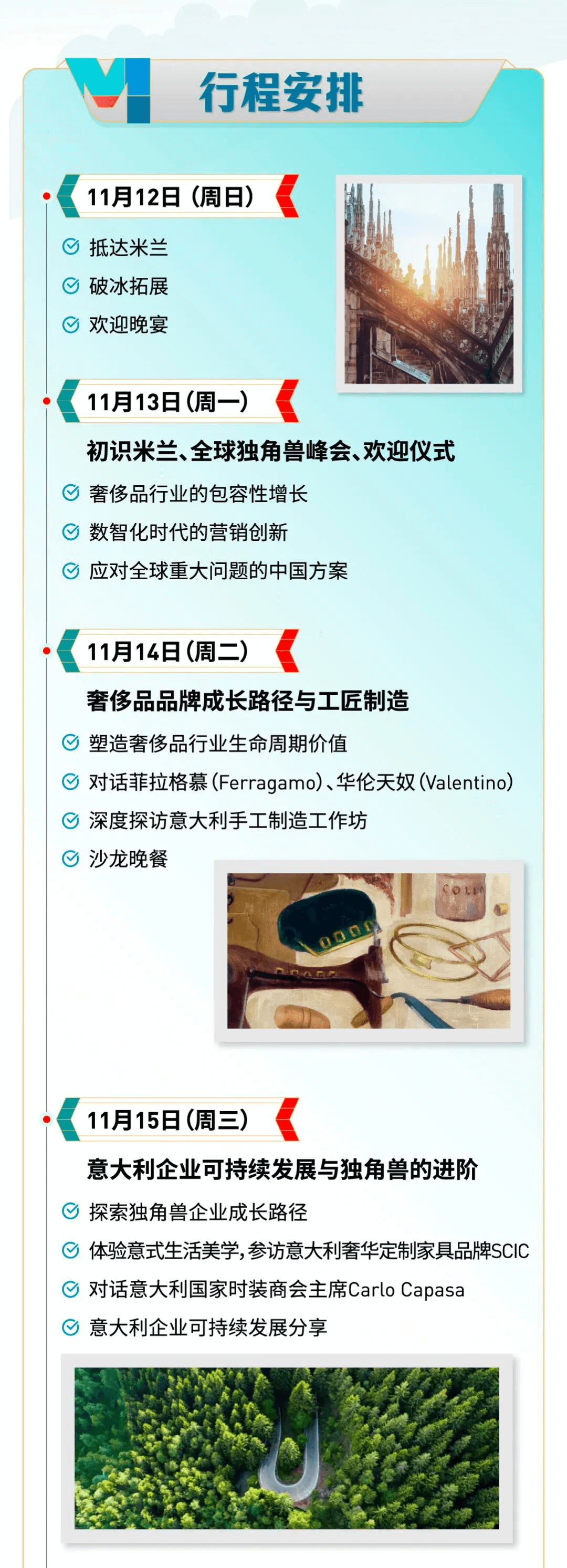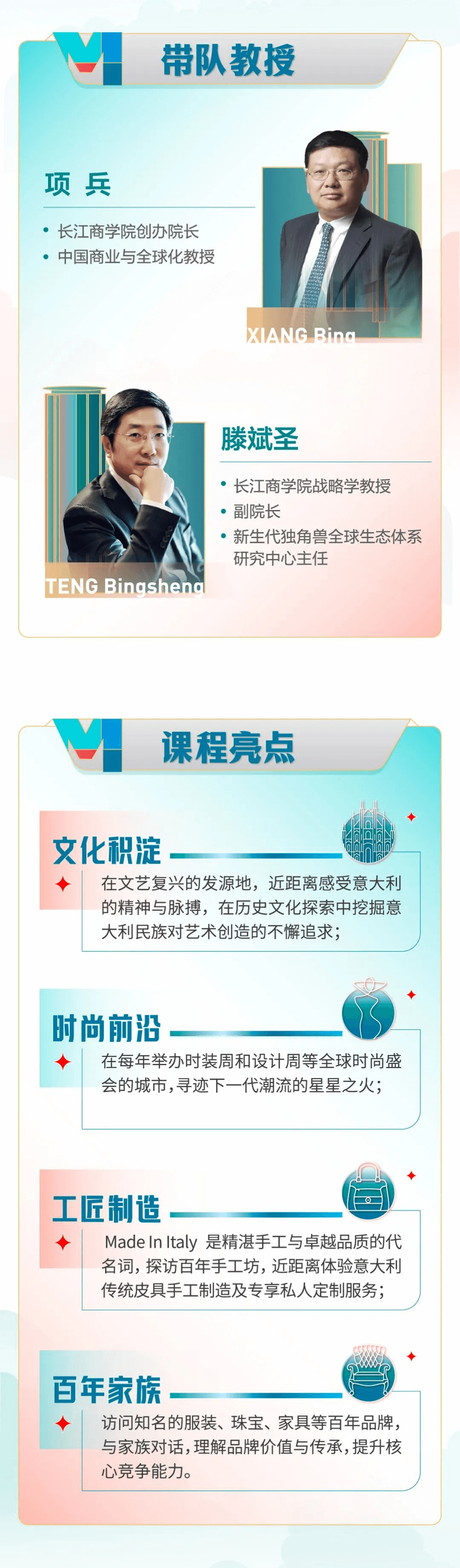 11月,長江商學院【獨角獸出海】項目-意大利米蘭站即將啟程,我們將在項兵院長和滕斌圣教授的帶領下,與意大利首府院?!綛occoni大學】開展課程合作,徜徉在意大利首府院校的課堂學習;走進百年企業和國際品牌,與家族成員交流、論道經營管理、洞察新機遇。