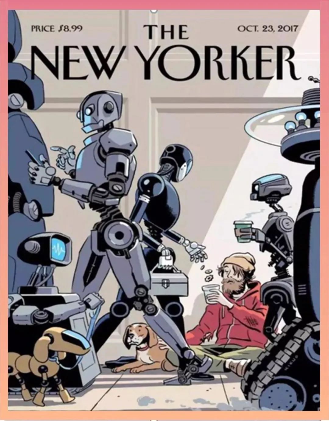 《The New Yorker》雜志有一期封面,描述的是進入人工智能時代后,我們的競爭者將是我們造出來的人工智能機器人,我們可能會向它們討飯吃。