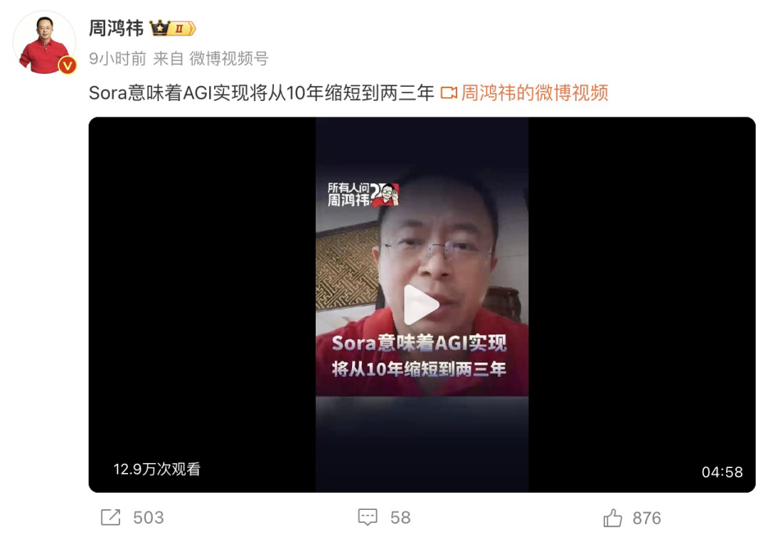 2月16日,360創(chuàng)始人周鴻祎發(fā)布微博提到自己對Sora的看法,周鴻祎認為,Sora的誕生意味著AGI(通用人工智能)實現(xiàn)可能從10年縮短至一兩年。