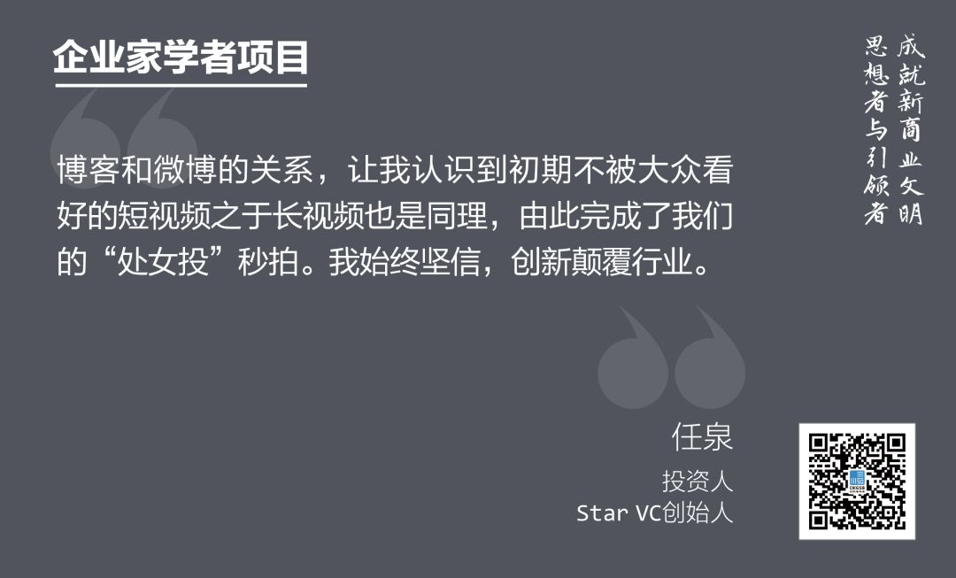 作為資深投資人,他在介紹自己早期投資一下科技的信念時(shí)說(shuō):“博客和微博的關(guān)系,讓我認(rèn)識(shí)到初期不被大眾看好的短視頻之于長(zhǎng)視頻也是同理,由此完成了我的人生‘處女投’。我始終堅(jiān)信,創(chuàng)新顛覆行業(yè)。”