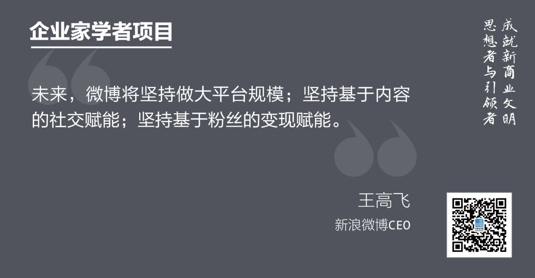 他認(rèn)為移動(dòng)互聯(lián)網(wǎng)的未來(lái)一定是社交平臺(tái)的天下,目前正在快速增長(zhǎng)期的微博致力于成為中國(guó)最大的社交媒體平臺(tái),相較于偏向內(nèi)容的微信和關(guān)注用戶使用時(shí)長(zhǎng)的抖音,微博的重要目標(biāo)是在數(shù)字經(jīng)濟(jì)時(shí)代專注于有用內(nèi)容的生產(chǎn)和主營(yíng)方向的變革。