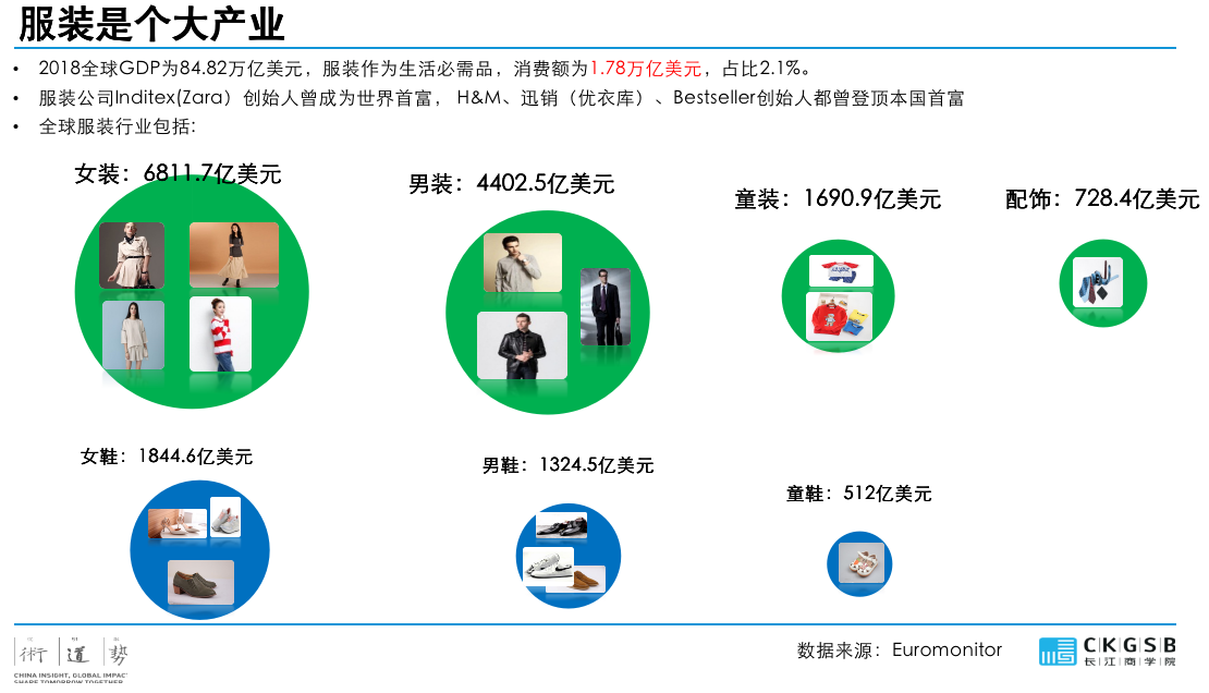 劉勁教授首先由大環境入手,通過數據直觀地為我們展現了服裝產業的大環境。服裝作為生活必需品,為GDP總額做出了極大貢獻。2018年GDP為84.52億元,而服裝產業便產生了1.78億萬美元的消費額,占總比的2.1%,其中女裝、女鞋的消費額相較于男裝、男鞋高出近50%消費額,隨著時間推移,該分布態勢趨向平穩。此外,服裝行業曾不斷衍生出各國首富,如Zara創始人、H&M創始人等。由此可見,服裝行業之大,產能之高,占據了國民日常生活的重要比重。