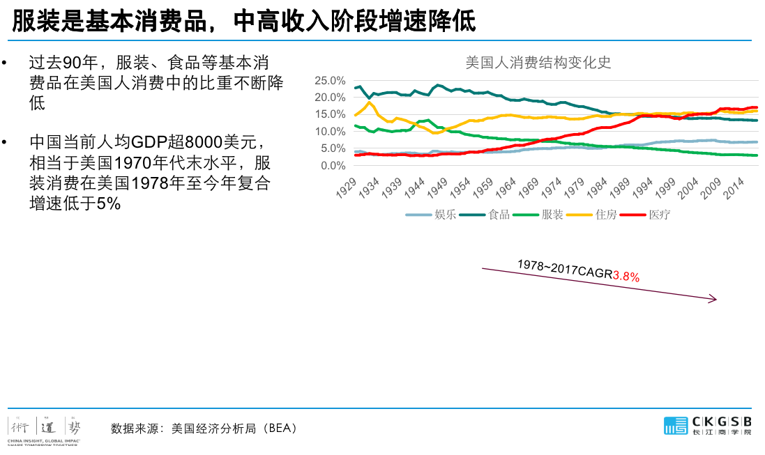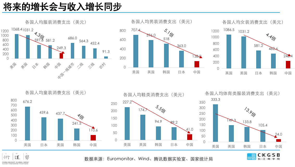 隨著國家經濟水平的發達、人均收入的升高,消費將進一步升級。美國人均收入是中國的4至5倍,人均服裝消費也比中國多出4.3倍。在未來、服裝行業的增長,基本將與國民人均收入增長掛鉤。