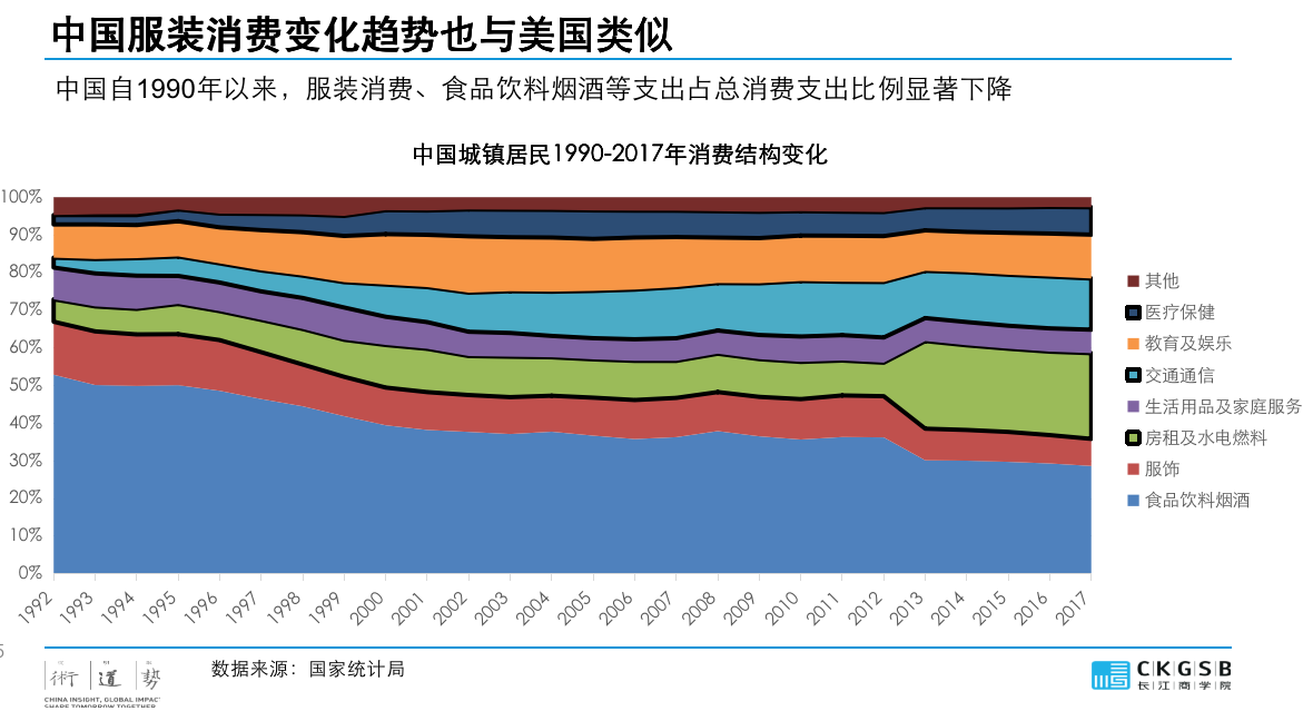 反觀中國,自1990年以來,隨著經濟的發展,國民消費水平的提升,飲食、服裝消費占比趨低,與美國消費趨勢一致。