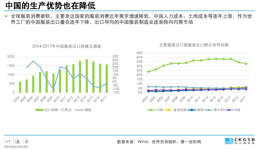 從生產端來看,中國作為全球最大的服裝制作國,隨著主要發達國家的服裝需求增速的降低,伴隨著中國人力成本、土地成本的逐年上漲,其生產優勢,包括產生的規模、增速及出口量在2014年后明顯下降。而孟加拉、越南、印度等生產成本較低的東南亞國家,成為了服裝產業生產轉移的新目標,帶動了其服裝產業的增長。