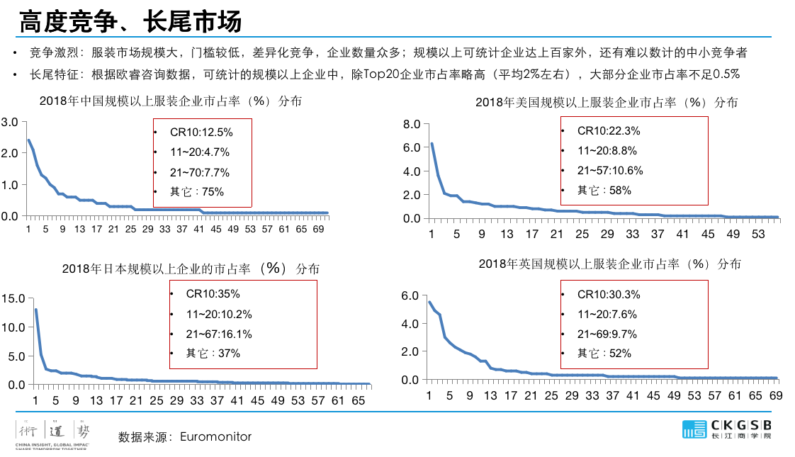 無論中美,服裝產業除了高度競爭外,更是以長尾需求為趨導的市場。從全球來看,服裝行業企業市占率集中度較低,中國目前集中度只有12.5%,大部分企業市占率不足0.5%。