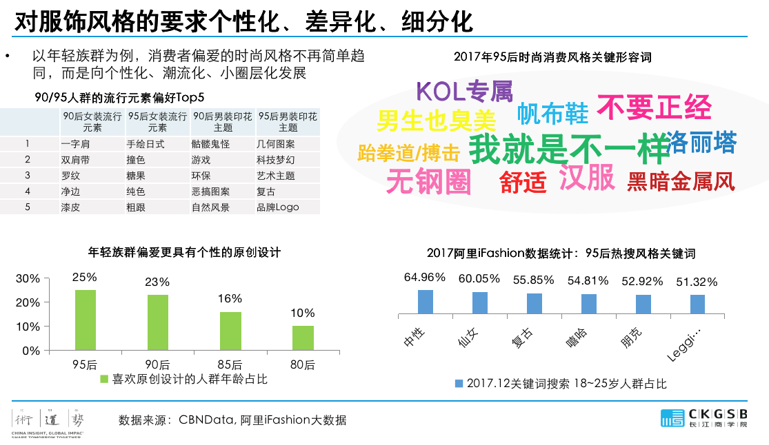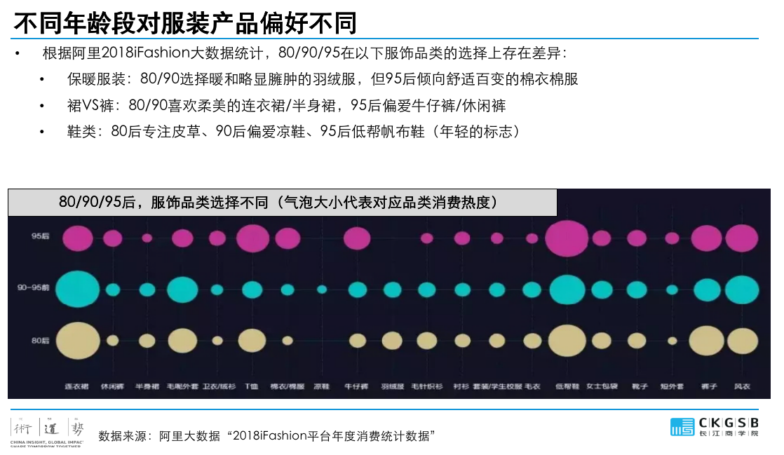 由阿里巴巴2018年對消費者的統計數據來看,不同年齡段在服飾品類的選擇上存在差異,各年齡段均有側重品類。同時由于消費的升級,人與人之間開始講究個性,即差異化。以年輕族群為例,不同風格服飾均有喜好者,更加追求小眾與個人喜好,服裝行業呈現個性化、差異化、細分化的態勢。
