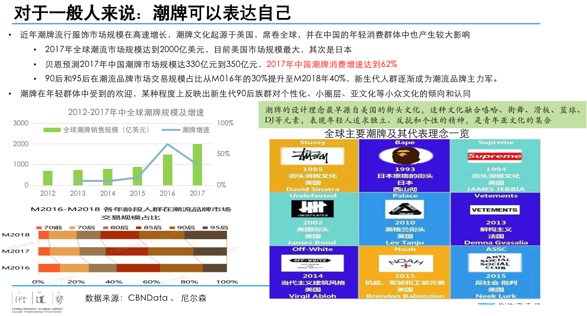 潮牌文化起源于美國,融合多種新潮元素,表現年輕人追求獨立、反抗和個性的精神,是青年亞文化的集合。如今,潮牌占市場規模正在高速增長,2017年全球市場規模已達2000億元,同年,中國潮牌消費增速達62%。