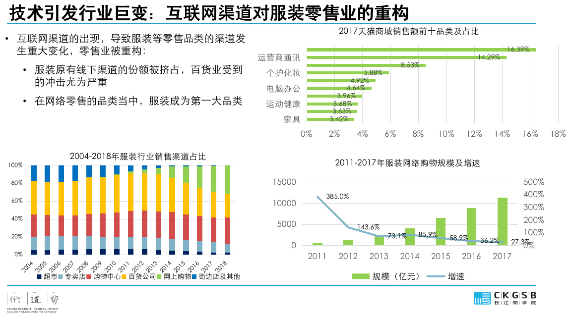 隨著信息技術的發展及互聯網對社會各個層面進行滲透,各行各業都在進行重組與變革。在服裝行業,2011年至2017年,服裝在線上的銷售增速長時間達30%以上,服裝原有線下渠道的份額被擠占,電商的出現,便是對傳統服裝行業的重構。
