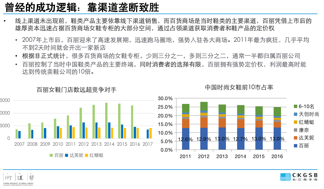 線上渠道未出現前,鞋類產品主要依靠線下渠道銷售,而百貨商場是當時鞋類的主要渠道,百麗憑借上市后的雄厚資本迅速占據百貨商場女鞋專柜的大部分空間,通過占領渠道獲取消費者和鞋產品的定價權 。然而隨著互聯網對行業的重構,線下渠道優勢不復,百貨公司隨之落寞。在百貨公司內占有巨大市場份額并以以渠道作為核心競爭力的百麗鞋業優勢不在,最后不得不進行私有化,應對互聯網帶來的改革。