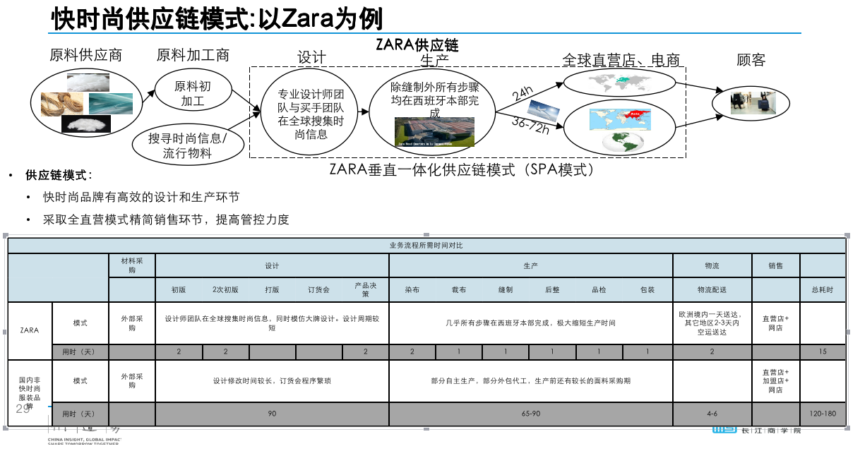 • 快時尚品牌具高效的設計和生產環節。傳統服裝品牌在設計環節上往往需要長時間修改,而快時尚品牌僅需要六天。