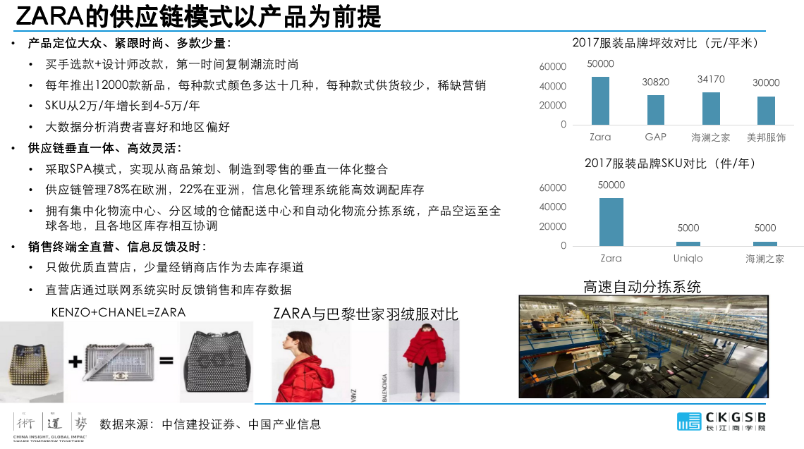 以ZARA為例,ZARA的供應鏈模式以產品為前提,定位大眾,通過多量少款、復制潮流時尚為戰略。供應鏈垂直一體,銷售終端全直營,從而達到信息反饋的及時性,緊跟市場步伐,未曾掉隊。