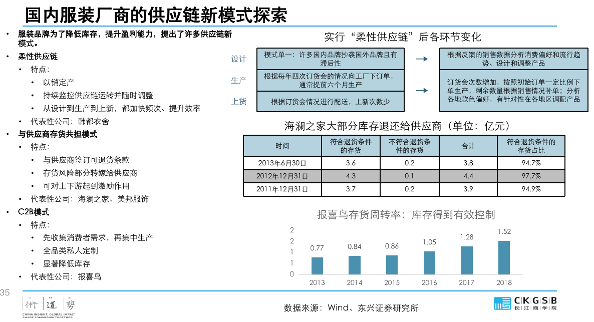 以海瀾之家、美邦服飾為代表的存貨共擔模式則與供應商簽訂可退貨條款,將存貨風險部分轉嫁給供應商。這樣一樣便可對上下游起到激勵作用。