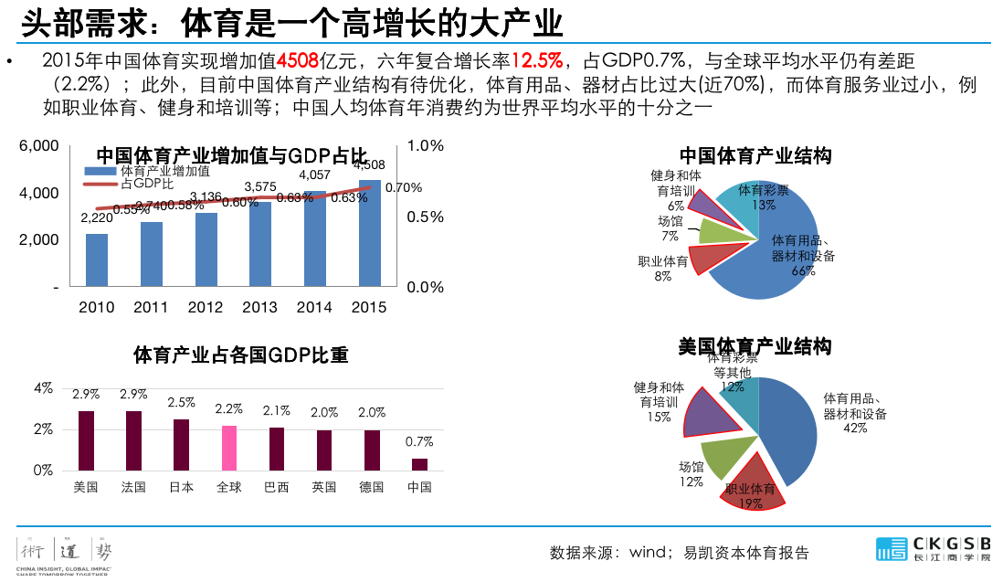 頭部需求典型的代表便是體育產業。如今,服裝展業隨著GDP的增長,占比隨之下降,反觀體育產業占比卻在提升。體育產業在全球GDP平均占比達2%,中國不到1%,美國達到將近3%,面對龐大的體育市場,體育用品,包括服裝也成為了巨大的需求。
