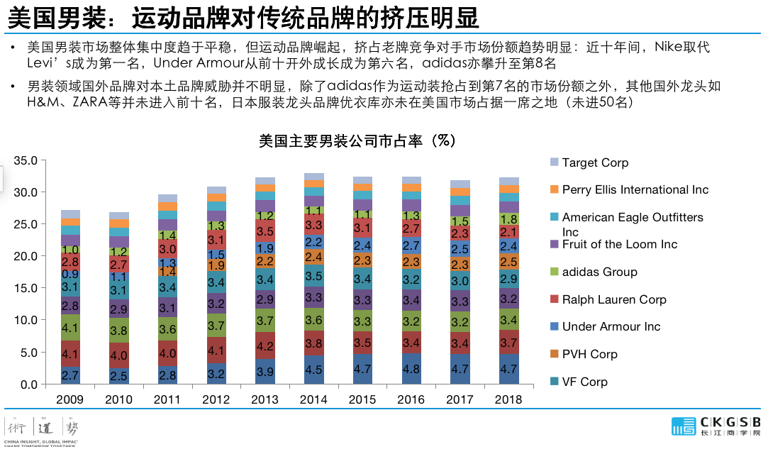 面對龐大的市場需求,運動品牌如雨后春筍一般迅速崛起。從數據來看,運動品牌的崛起迅速擠占了老牌競爭對手市場份額,Nike取代Levi’s成為第一,Under Armour從前十開外成長為第六名,Adidas攀升至第8名。至此,運動品牌已成為了美國男裝市場的主力軍。