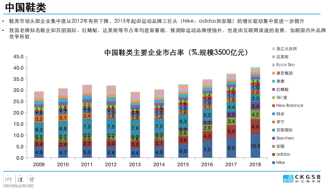 在中國,體育同樣作為頭部需求,體育品牌占比越來越大的同時,也勢必擠壓其他傳統品牌。至2018年,中國鞋類主要企業市占率頭部企業大部分均為運動品牌,Nike、Adidas、安踏更是呈現穩步上升趨勢,而百麗國際等非體育品牌則逐漸下滑。