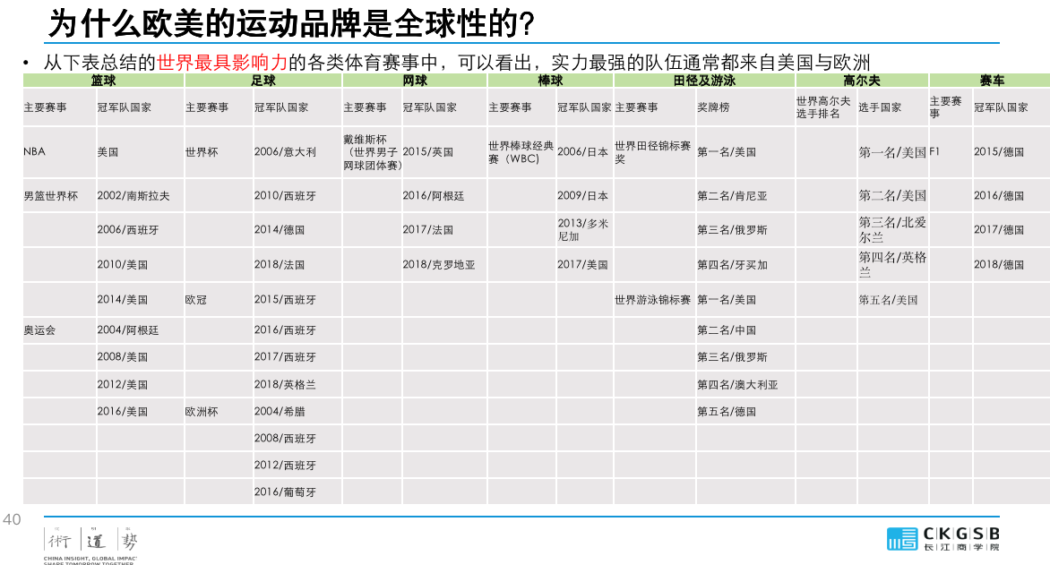 縱觀全球重要的體育賽事,若說起籃球,想的的絕對是NBA,足球想起的則是歐冠等等,國外大勢運動項目在中國并不普及。同時,重大的體育賽事大部分都在西方,使用的是西方的體育品牌,這一文化輸出對人們對體育品牌的認知有極大的影響。