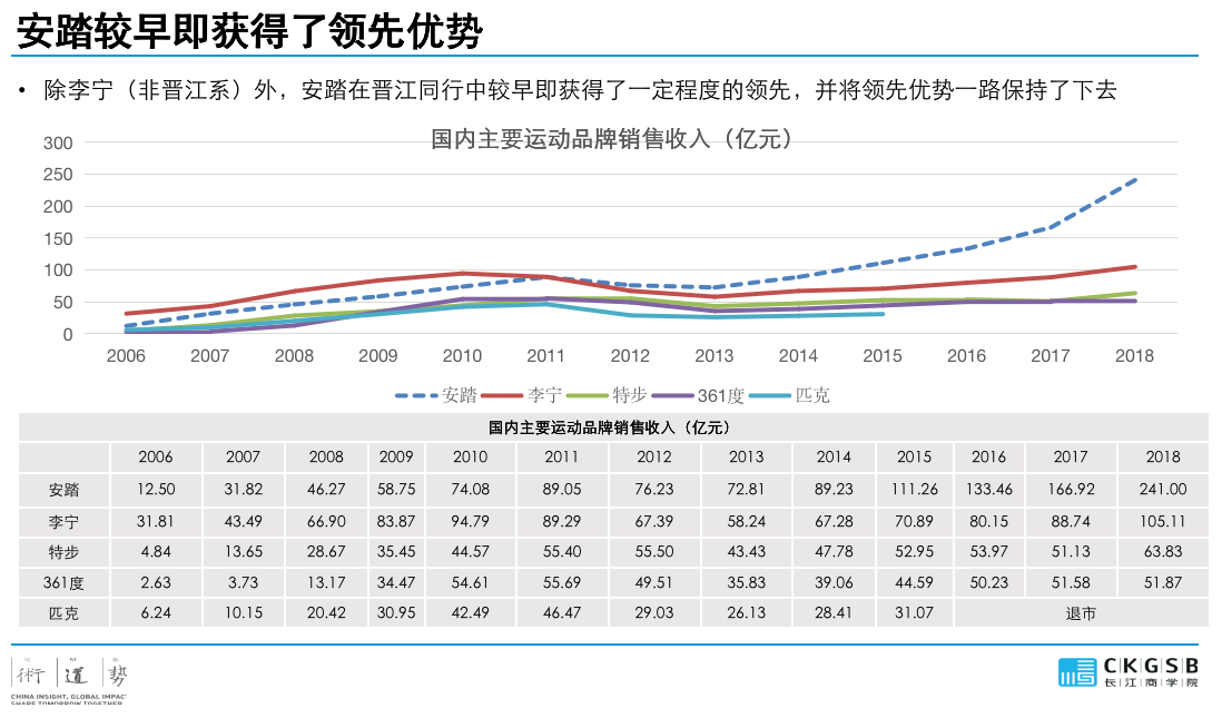 在服裝產業競爭激烈,體育成為頭部需求的今天,安踏以絕對的優勢站在了行業的頭部。至2018年,相較李寧105.11億的銷售收入,安踏以241億銷售收入穩居首位。