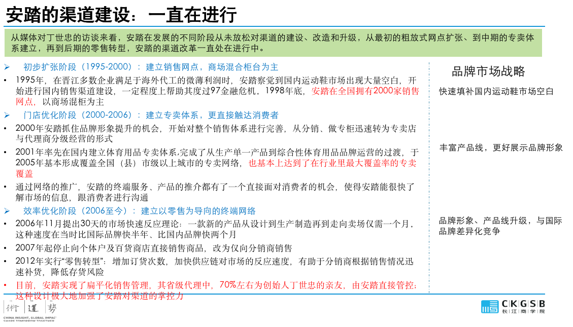 安踏能穩居頭部,主要歸功于對渠道的管控,以及針對不同階段做出快速反應對渠道進行升級及改造。以下是安踏渠道建立的三個階段: