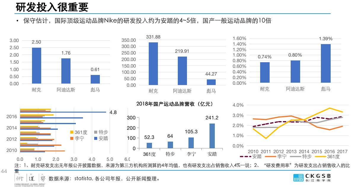 在擁有渠道優勢的同時,作為體育用品企業,為提高生產、物料的技術含量,安踏對自身產品的研發、升級做出了極大的投入。至2017年安踏在研發上已投入4.8億元,雖仍不及國際體育品牌,但相較于其他國內體育品牌,達到了兩倍之差。