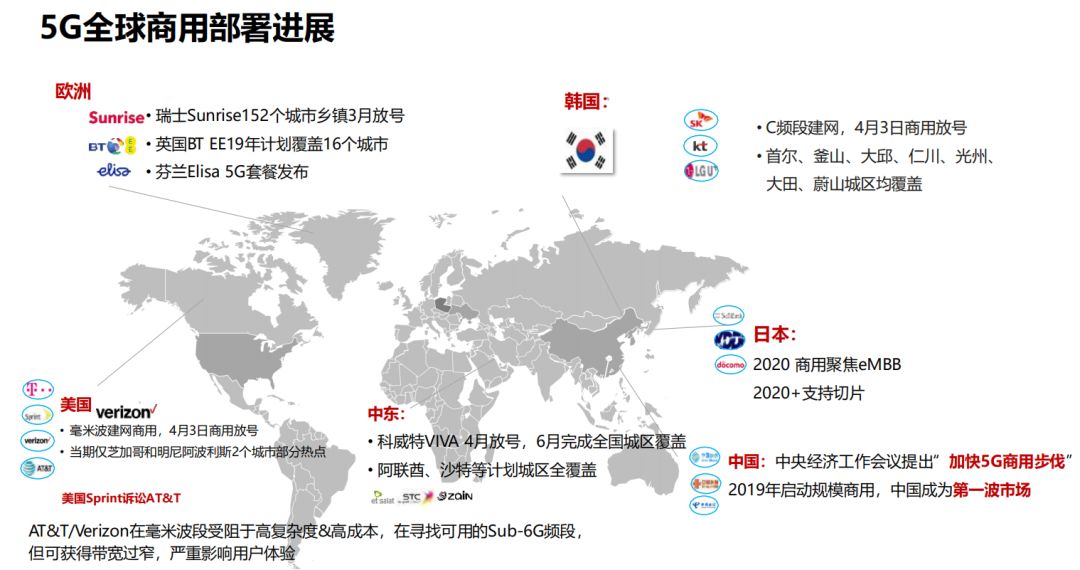 在世界范圍內(nèi),真正的5G商用部署來自于美國運(yùn)營商與韓國三大運(yùn)營商,其在4月份已經(jīng)正式對外商用,并且能夠?qū)ν獍l(fā)射信號,提供整個終端設(shè)備。