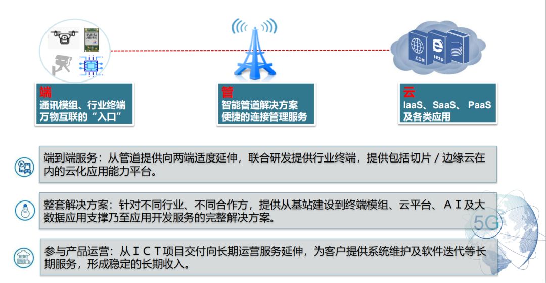 云管端作為運(yùn)營商的網(wǎng)絡(luò)構(gòu)成,端即各類終端;管是管道、寬帶能力;云便是云端提供的能力。