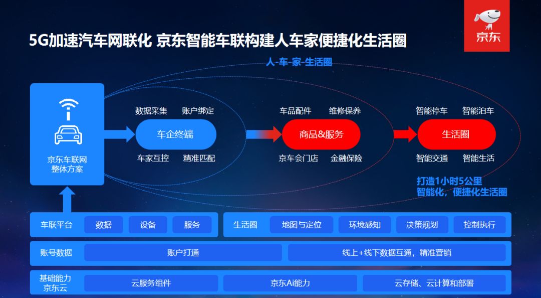 在5G和車聯(lián)網(wǎng)將結(jié)合緊密的5G時代,京東將打造“人—車—家”的生活圈,提供更便捷的智能生活。其中,部分已經(jīng)在奔馳、北汽、吉利多個企業(yè)當(dāng)中落地。