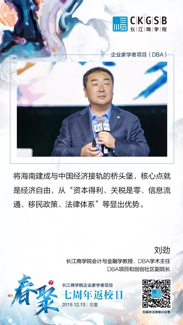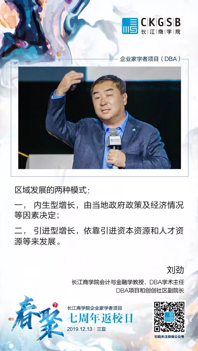 長江商學院會計與金融學教授、DBA學術主任、DBA項目和創創社區副院長劉勁分享了“海南的改革與發展分析”,從海南的概況和經濟現狀引出區域發展的對策,用實例講述了“內生型增長”與“引進型增長”兩種發展模式。劉勁教授認為,引進型發展的資本和企業要從“別處”來,所以引進型發展存在競爭性,而內生型增長的潛力決定了引進型發展的競爭能力。將海南對比夏威夷,得出海南的發展必須有重大的政策突破,必須解放思想、放下包袱實現經濟自由,從“資本得利、關稅是零、信息流通、移民政策、法律體系”等方面顯出優勢。