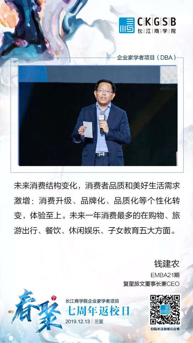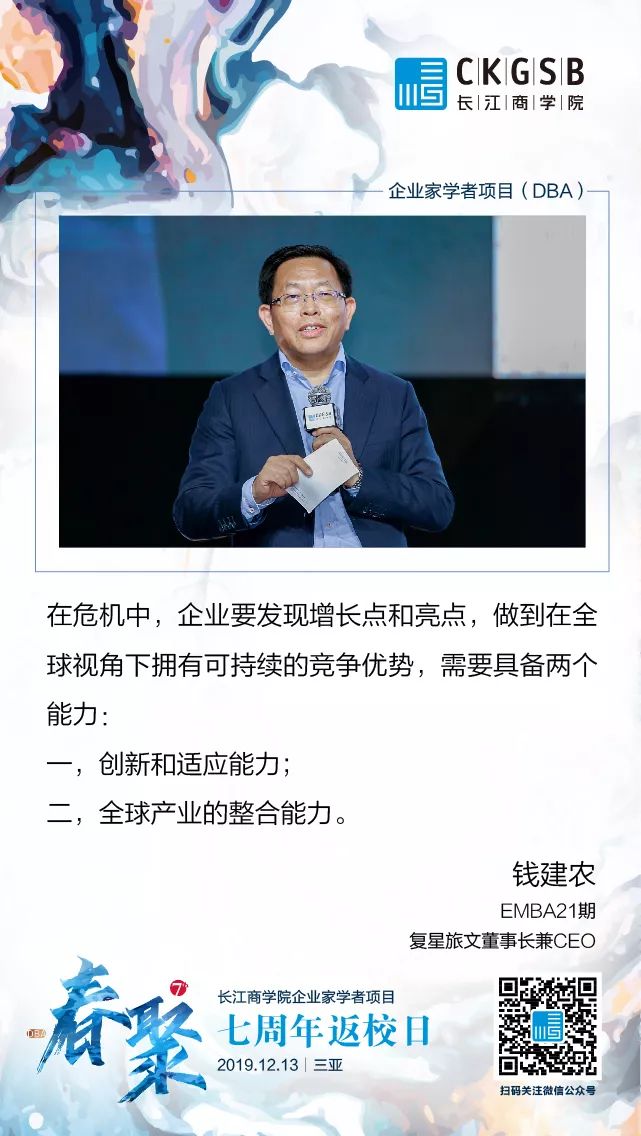 EMBA21期校友、復星旅文董事長兼CEO錢建農針對“全球視角下的可持續競爭優勢”做出了深入闡述,他認為,企業要想在全球視角下擁有可持續的競爭優勢,發現增長點和亮點,必須具備“創新和適應能力”及“全球產業的整合能力”。除此之外,企業還需看清未來行業痛點和面對的挑戰:曾經粗放發展,需要升級迭代;消費者需求已變,舊模式不再適用;缺少全球品牌力和影響力等趨勢、現狀。