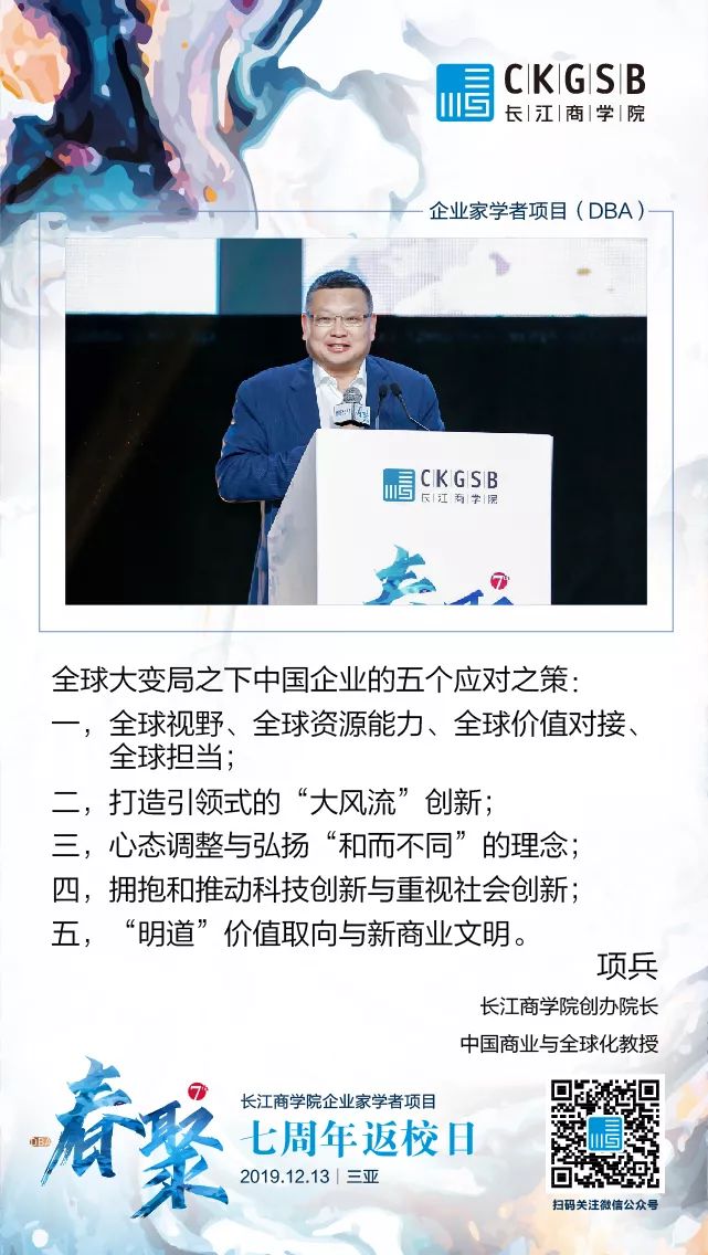 長江商學院創辦院長、中國商業與全球化教授項兵圍繞“全球大變局”為企業家學者們分享了“全球大變局及其影響”、“全球大變局下中國的應對之策(國家層面)”、“全球大變局下中國的應對之策(企業層面)”三大部分內容。項兵院長認為,這是一個多種顛覆式變革匯聚的時代,在這樣的背景下,對企業影響最大的三個變革分別是:三大主義(新自由主義、國家資本主義、社會民主主義)發展模式的不平衡;顛覆性科技的潛在社會影響與應對;全球貿易與投資體系重構、中美博弈。應對變革,中國企業必須肩負和加強:全球視野、全球資源能力、全球價值對接、全球擔當;打造引領式的“大風流”創新;心態調整與弘揚“和而不同”的理念;擁抱和推動科技創新與重視社會創新;“明道”價值取向與新商業文明等策略。