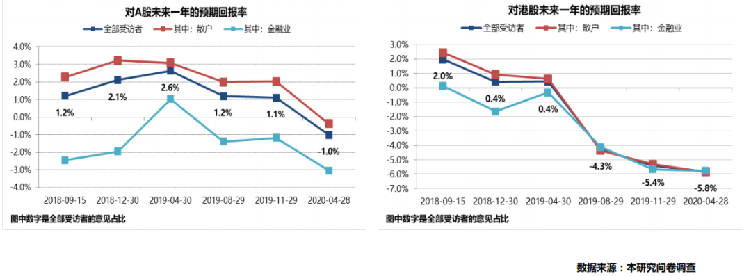 研究結(jié)果顯示,目前投資者對股市、房市持悲觀情緒。參與調(diào)研的投資者預(yù)期的對A股、港股未來一年的預(yù)期回報率分別為-1%、-5.8%,對房價未來一年的預(yù)期回報率也降至1.6%。劉勁教授分析,投資者對股市、房市的悲觀情緒,除了是受疫情的影響,中美貿(mào)易戰(zhàn)、香港的政治局勢,以及樓市限價令等也是不可忽視的因素。