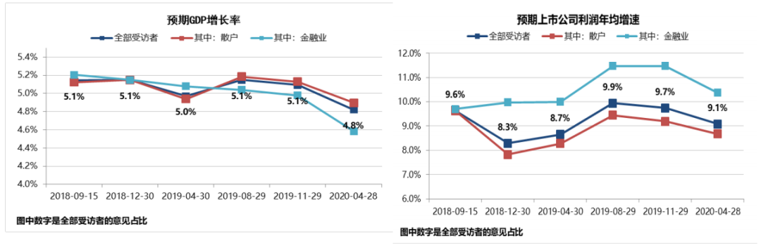 除了對股市、房市悲觀,投資者還持續(xù)下調(diào)對基本面的預(yù)期。由于新冠疫情和中美貿(mào)易戰(zhàn),被調(diào)研的投資者一方面下調(diào)了對國內(nèi)GDP增長率的預(yù)期,另一方面下調(diào)了對上市公司利潤增長率的預(yù)期。