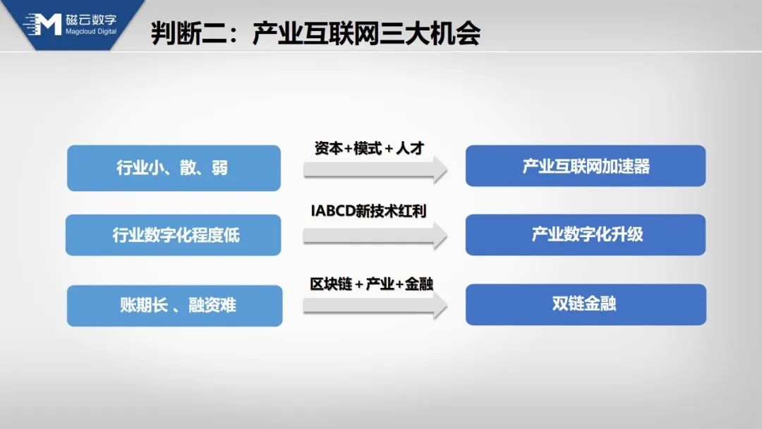 第一個機會,我觀察了很多行業,尤其是萬億級的行業,都出現散、小、弱等特征。行業發展的規律一定是整合,在西方產業革命發展的路上,它是用資本進行整合。我們認為在互聯網的時代,整合的方向應該是資本+互聯網手段,更快的來完成產業互聯網的整合。這就會出現一些產業互聯網的平臺,用平臺的模式來把中小微企業團結起來。讓無序的行業變得有序,重構行業的規則,并且用互聯網的新科技手段加上產業金融這種新的供應鏈金融模式,來完成產業互聯網的加速。