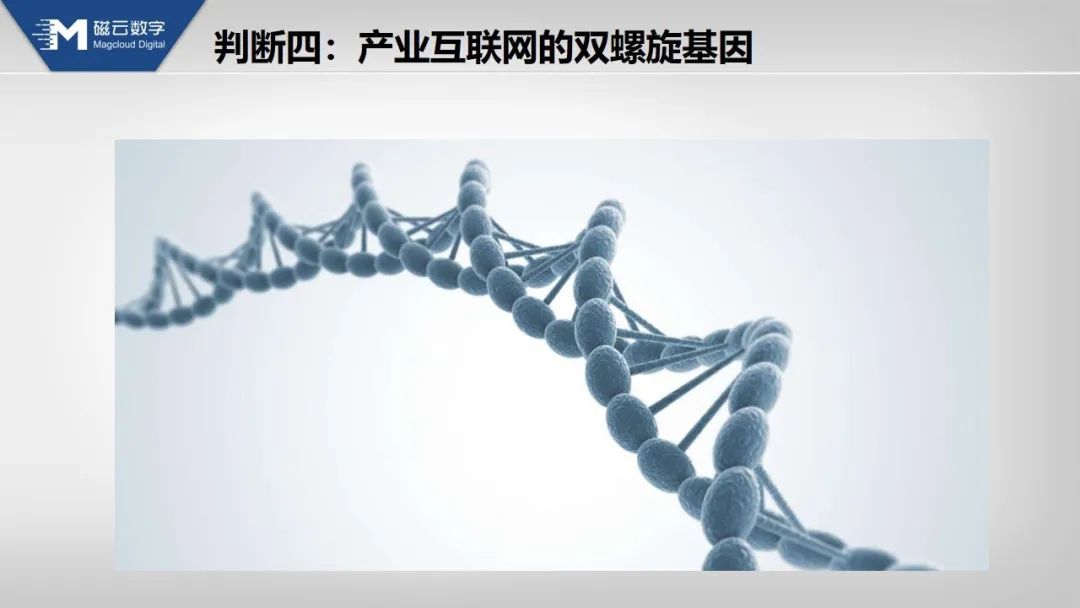 我認為這兩種人結合在一起,可以把產業互聯網做成。我比喻說這是兩種基因,分別形成一個單螺旋,兩個單螺旋組合在一起,這就是我們互聯網雙螺旋基因結構。當然我強調了,它一定要發生基因的變異,比如說如果不能改變傳統產業的觀念,它的轉型升級將面臨幾個大的問題。