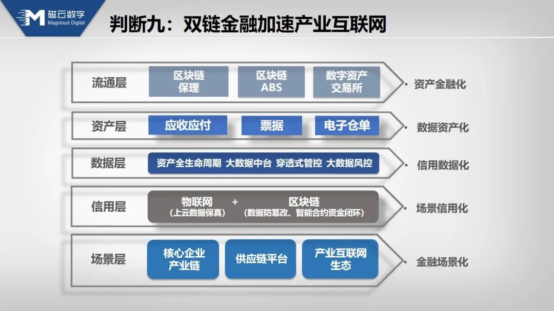 最底層是場景層,典型的場景包括核心企業的這些供應鏈,它的上下游。如果我們核心企業能夠完成數字化的升級,這個場景就更容易跟創新的雙鏈金融結合。