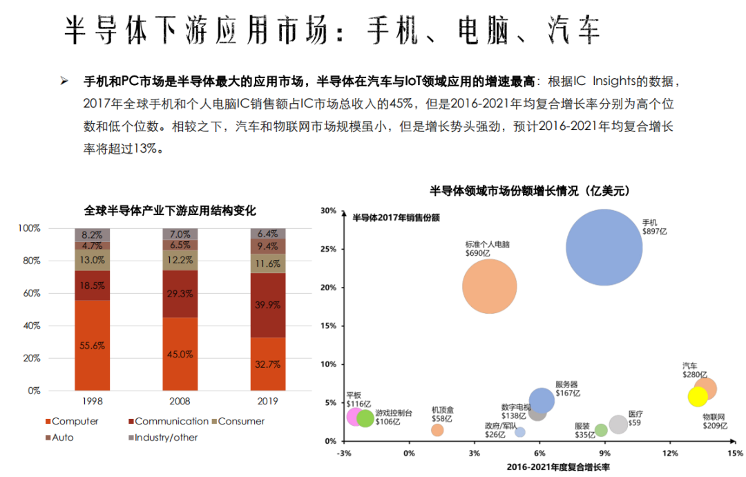 集成電路下游市場在過去十幾年間有著巨大的變化。1998年,集成電路下游市場應用55%是計算機,18%是手機。發展到2019年,集成電路下游市場32%是計算機,40%是手機,手機的市場份額增長了2.2倍。