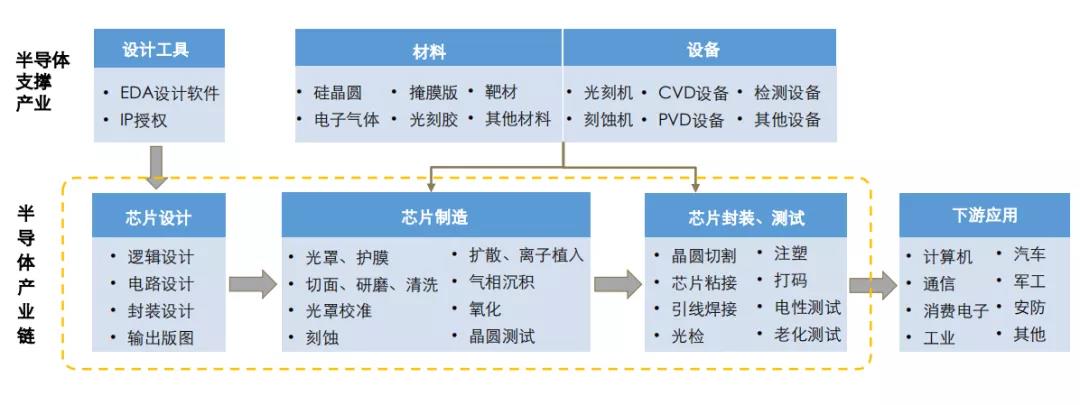 從半導體產業鏈角度來看,半導體材料和設備位于產業上游,是整個半導體行業的支撐產業,中游為半導體的制造,其中集成電路的制造最為復雜,又可以分為“設計-制造-封測”三個環節,而集成電路制造的資金和技術壁壘最高。