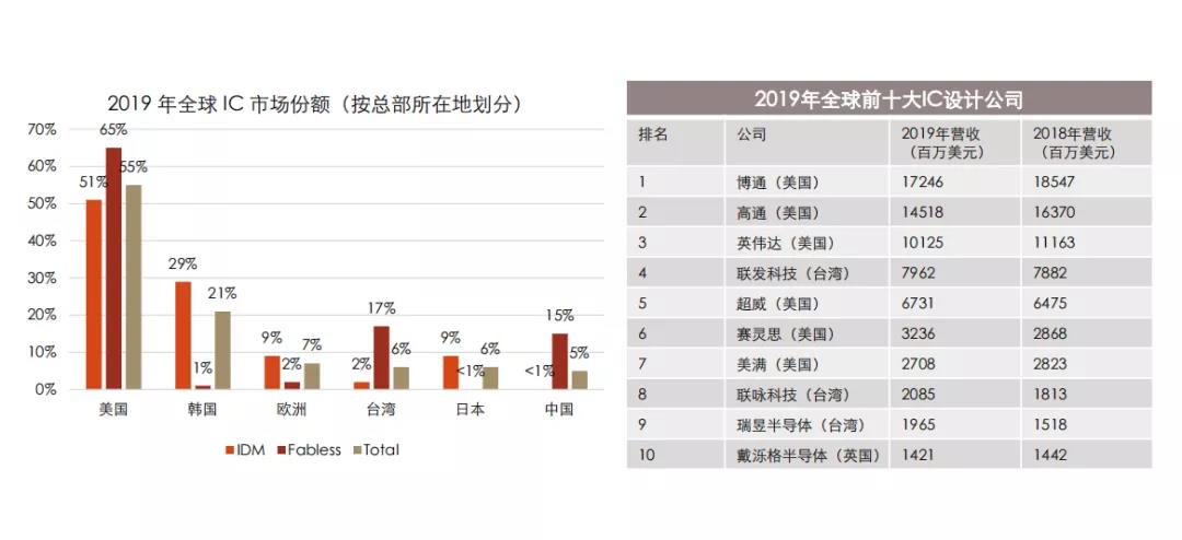 當前全球IC設計仍以美國為主導,我國只是重要參與者,尤其是在核心通用芯片設計領域,如CPU、存儲器、FPGA以及高性能模擬芯片等領域占有率幾乎為零。2019 年美國占據了全球IC設計行業65%的市場份額,居世界首位;中國臺灣地區的市場占有率約17%,中國大陸的市場占有率為15%;兩者位于第二、三位,但中國的技術含量比別的國家落后。
