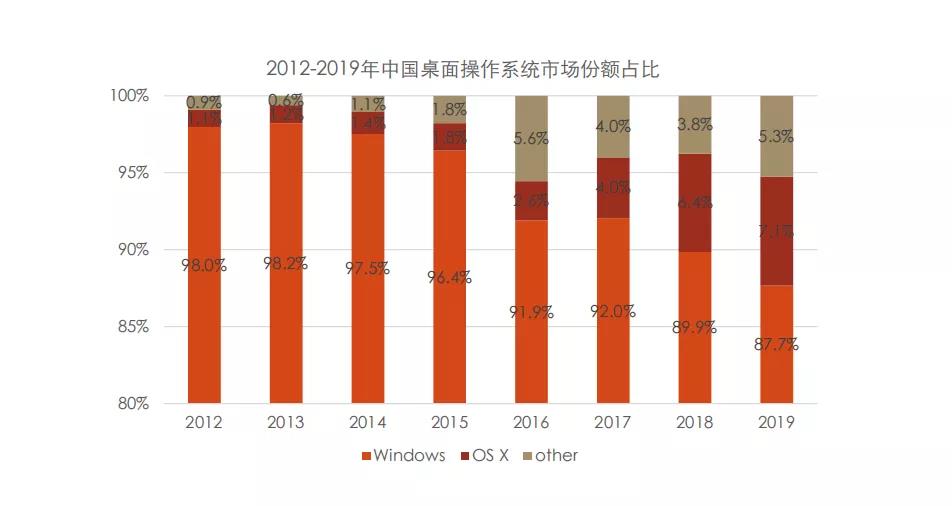 2019年,Windows操作系統的市場占有率高達87.7%,蘋果占據7%,其他PC操作系統包括Linux/Unix等市場份額較小,只占5.3%。