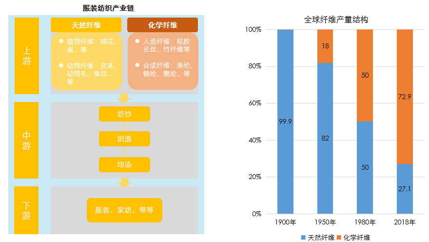 劉教授指出,化工在全球經濟中扮演著重要角色,處在制造業的前端,提供基礎的制造業原料。以服裝紡織產業鏈為例,從1900年至2018年,全球服裝、家紡等產品所使用的纖維中,化學纖維占比不斷提高,至2018年,化學纖維占比已達73%。