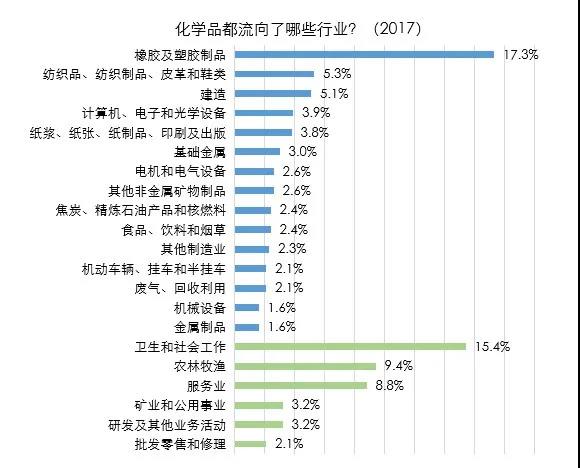 目前,化學工業幾乎投入了所有的經濟部門,除化學品制造商本身以外,化學制品最大的工業用戶是橡膠和塑料、紡織品、建筑、計算機生產以及紙漿和造紙部門??偟膩砜?,出售給下游用戶的全球化學品中有近58%轉移到了其他工業領域,其余則轉移到全球經濟的其他部門,例如衛生和社會工作,農業和服務業。