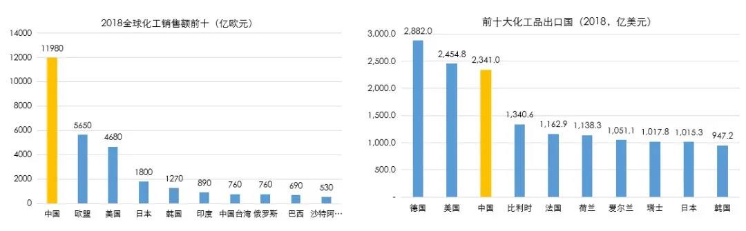 從銷售總量來看,2018年中國的化工品銷售額為1.2萬億歐元,是世界上最大的化學品消費國,占全球總量的35.8%;從出口情況來看,中國是第三大化學品出口國,占據全球總出口量的9.2%, 德國和美國分居一二位。