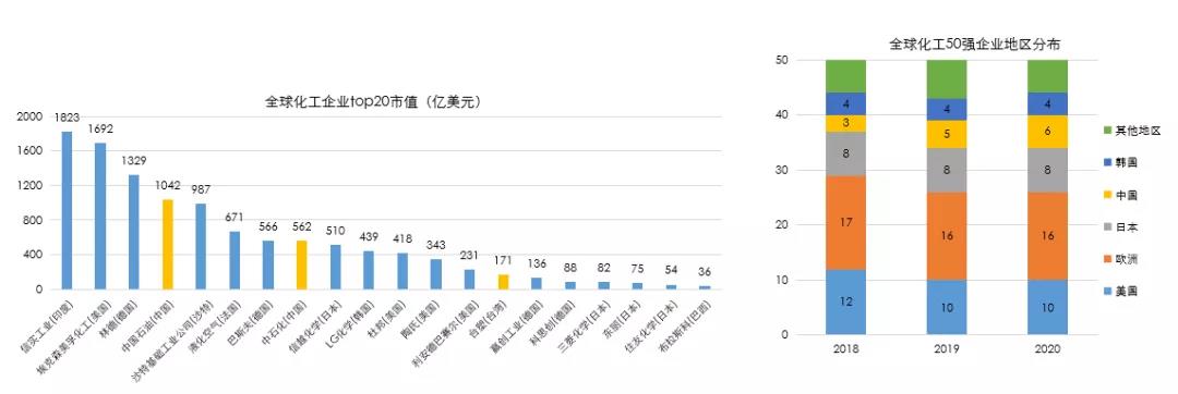 從各國擁有的化工巨頭企業角度分析,2020年美國化學與工程新聞雜志發布全球化工企業50強榜單,上榜企業中歐洲企業數量最多,其次是美國,中國企業有6家上榜,分別為中石化(2)、臺塑(6)、中石油排名(13)、恒力石化(26),中國化工集團旗下的先正達(29)、萬華化學(32)。此外,全球化工企業市值TOP20的公司,中國上榜的是中石油、中石化這類產業鏈上端的石油公司,而下端的新材料公司中國則榜上無名。