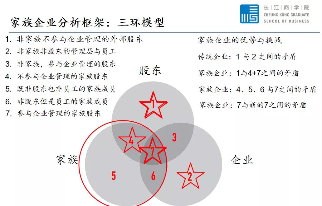 家族企業(yè)作為重要經(jīng)濟(jì)體,也是復(fù)雜矛盾體。家族、股東和企業(yè)等相關(guān)者,由于利益、位置的差異,會(huì)帶來各式各樣的潛在矛盾。李教授認(rèn)為,分析家族企業(yè)有一個(gè)經(jīng)典模型——三環(huán)模型,“通過此模型,每一個(gè)家族企業(yè)可把不同的人在企業(yè)里的位置放在里面,以此來理解他們各自的利益訴求和可能引發(fā)的潛在矛盾,這是一個(gè)分析的框架。”