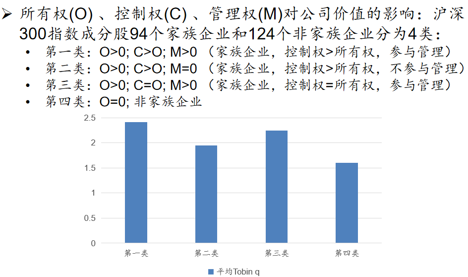 “站在金融學(xué)的視角來分析,多數(shù)行業(yè)的家族企業(yè)經(jīng)營狀況跑贏所處行業(yè)的平均水平,證明家族企業(yè)確實(shí)有非常強(qiáng)創(chuàng)造價(jià)值的能力。看O-C-M對(duì)企業(yè)經(jīng)營的影響,可以發(fā)現(xiàn)Tobin Q(估值)更高的企業(yè),具有這樣的特點(diǎn):家族企業(yè)中控制權(quán)大于所有權(quán),且家族成員參與管理。”